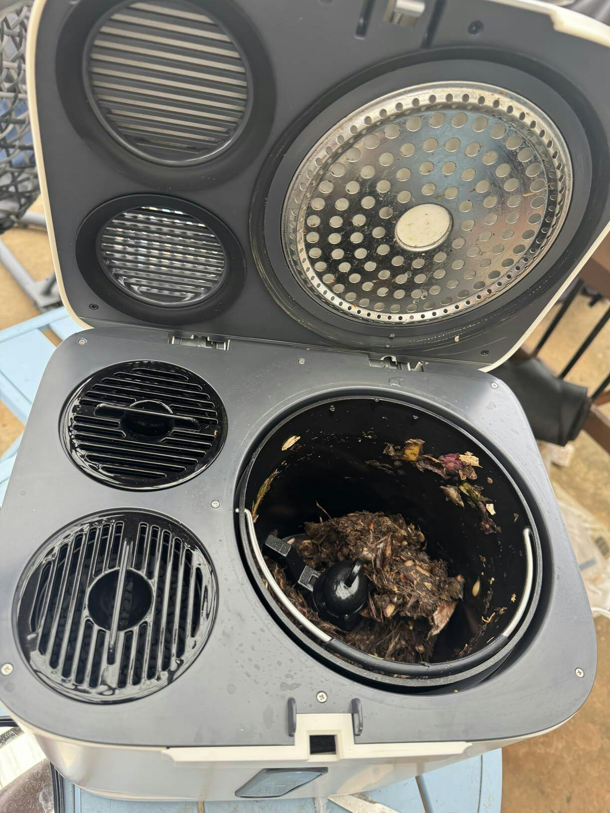 Doesn’t always dehydrate on the first round, but it’s worked pretty well over the first month or so. Doesn’t create a fine silt but creates a final product thats fairly dirt like and goes right into my flower bed outside when it’s done. It also does a decent job of keeping the odors down, and it’s not super loud when it’s running