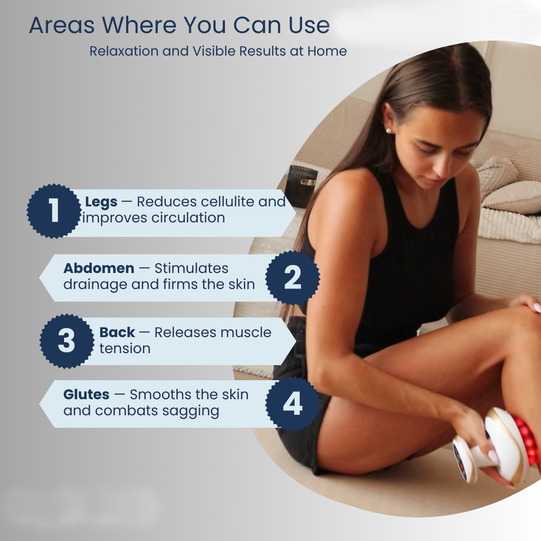 Target stiffness, cellulite and everyday soreness with adjustable heat, 6 levels of deep suction and a USB-rechargeable design. One compact device to relax your legs, back and feet right at home.
